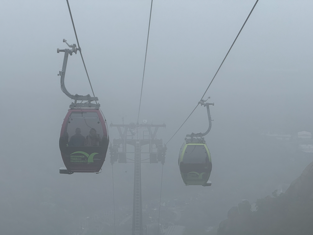 Oben angekommen wurde uns die Aussicht doch ziemlich durch den Dunst und Nebel verwehrt, aber auch so war es interessant, das Treiben hier oben zu beobachten. Hier war richtig viel los und man konnte erahnen, dass wohl jedes Geschäft hier oben (und es gibt einige) im Laufe der Saison auf seine Kosten kommt.