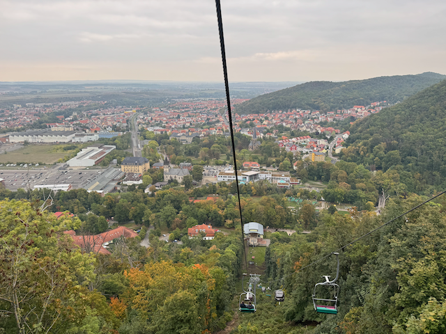 Am Samstag ging es nach einem opulenten Frühstück (unter anderem mit einer Mettkugel in der Größe eines Handballs) zur nahegelegen Seilbahn, die zum Hexentanzplatz hinaufführte. Die Fahrt mit der Seilbahn ist für sich schon ein Erlebnis. Wenn man das Glück hat, eine der Gondeln mit Glasboden zu erwischen, noch einmal mehr.