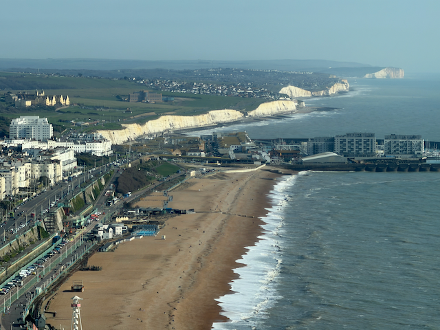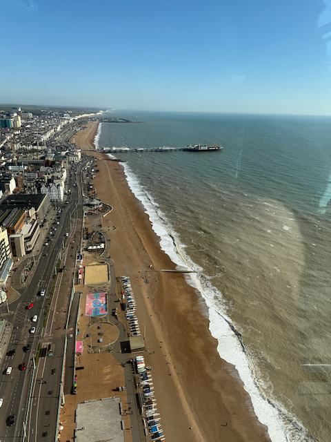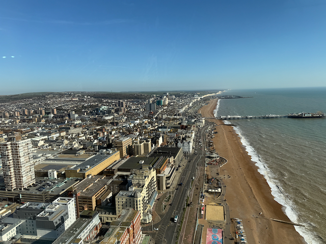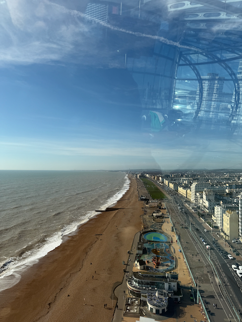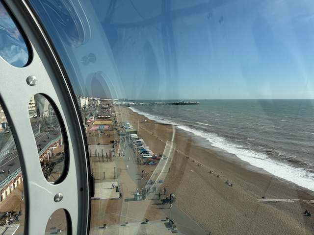Erster Haltepunkt- und wahrscheinlich der spektakulärste auf unserer Reise – ist der Brighton i360 (ursprünglich British Airways i360). Der vor 10 Jahren eröffnete Aussichtsturm verfügt über eine ringförmige und verglaste Aussichtsplattform, die barrierefrei genutzt werden kann und auf 138m hochgefahren werden kann.