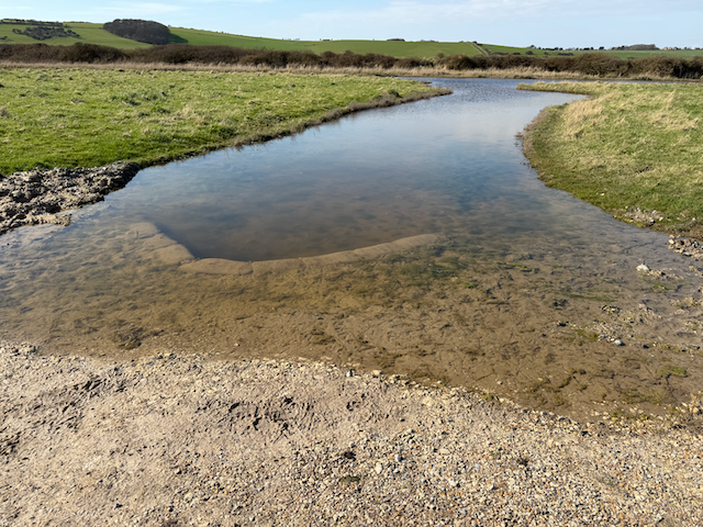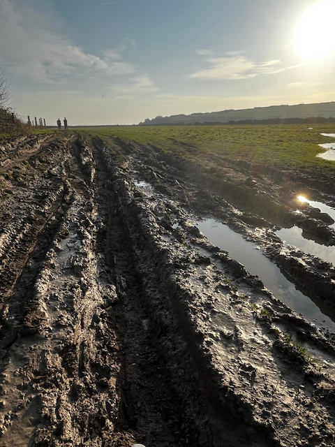 Womit wir allerdings nicht gerechnet haben ist, dass wir vielleicht ein klein wenig zu optmistisch an die Sache herangegangen sind. Direkt vom Parkplatz weg führt der tatsächlich barrierefreie Weg am Cuckmere River entlang bis zum Meer. Gute 2,5km beanspruchen uns nicht zu sehr und auch jetzt schon bieten sich schöne Ausblicke. Am Ende geht es über eine Steigung an den Steinstrand. In unserer „Euphorie“ lassen wir uns von einigen hilfsbereiten Engländern über die Steigung helfen und stehen nach einigen Metern am Strand mit wunderbarem Ausblick auf das Meer und auf einige Klippen. Dass es bis hierher so gut ging und die Karte etwa 500m entfernt einen alternativen Weg zurück zum Parkplatz zeigt, verleitet uns dazu, nicht den Rückweg über den betonierten Weg anzutreten, sondern uns bis zu dem Weg direkt am Fuß der Klippe vorzukämpfen. Und ja, in gewisser Weise war es ein Kampf. Wir bringen die 500m hinter uns- teils, indem Kristin vorsichtig immer wieder ein Stück auf den Steinen läuft und teils, indem ich sie mitsamt Rollstuhl einen Fuß nach dem anderen setzend rückwärts durch das Geröllfeld „zerre“. Die Freude, dass wir die letzten 50m zum Weg den Rollstuhl wieder normal schieben können, währt indes nicht lang. Gleich der Anfang des Weges wird durch ein ziemlich großes Matsch-Loch versperrt. Umkehren ist für uns in dem Moment keine Option. Wir haben bestimmt mehr als eine Stunde gebraucht, um den Weg am Strand zu überwinden. Also stellen wir uns dem Matsch. Den Rollstuhl im 45 Grad-Winkel daran vorbeizuziehen, gelingt nur, weil Kristin einen Stock verwendet, um sich und den Rollstuhl abzustützen und weil eine hilfsbereite Engländerin herbeieilt und uns vor einer unrühmlichen Landung im Matsch bewahrt.